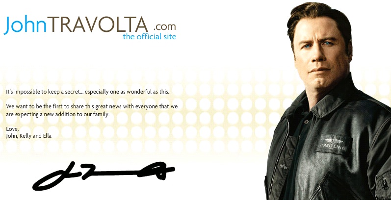 When we said “soon”, we were not talking about today! No one was supposed to know about this for a couple more weeks, because Kelly isn’t very far along in her pregnancy. Just eight hours after we published the pregnancy as a BlindGossip item, Star Magazine was all over it, and then the Travoltas issued a public statement on their website. It’s now being reported via People and Entertainment Tonight and all the mainstream news outlets. But BlindGossip readers were the first in the world to know!